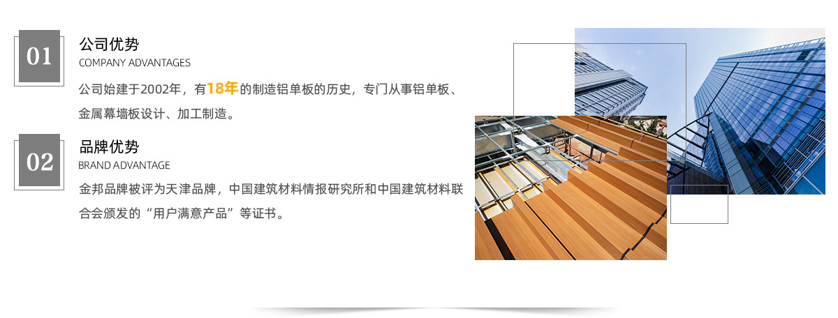 天津金邦建材有限公司始建于2002年,有18年的制造鋁單板的歷史,天津金邦晟泰建材有限公司傳承于天津金邦建材有限公司,從事鋁單板、金屬幕墻板設計、加工制造,公司堅持走自我創新之路,近年來碩果累累,實現了公司的飛速發展。2017年為適應新市場,配合產業升級改造,天津金邦建材有限公司全資投建天津金邦晟泰建材有限公司,公司注冊地為天津靜海區中旺產業園內,占地60余畝,新建全華北地區全自動噴淋生產線,引進蒙皮拉伸雙曲設備,4軸雕刻機等先進生產設備。同時公司在原有鋁單板產品基礎上進行產品創新,新增加多維板、蜂窩板連續自動生產線,從而更加豐富的產品系列,為業主提供更多更好的幕墻材料解決方案。公司擁有實力技術團隊,根據業主和設計師的需求對圖紙進行合理深化,并根據不同需求對金屬材料進行合理搭配,詮釋建筑的設計理念,締造建筑風格。